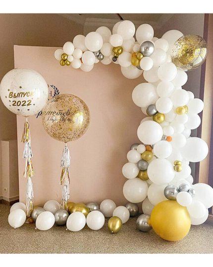 Один из способов использования воздушных шаров при оформлении сцены — это создание гирлянды из шаров. Эта гирлянда может быть размещена над сценой или на боковых стенах. Выбирая цвета для гирлянды, следует руководствоваться общей цветовой гаммой мероприятия. Например, можно выбрать нежные оттенки розового, фиолетового или белого цвета.