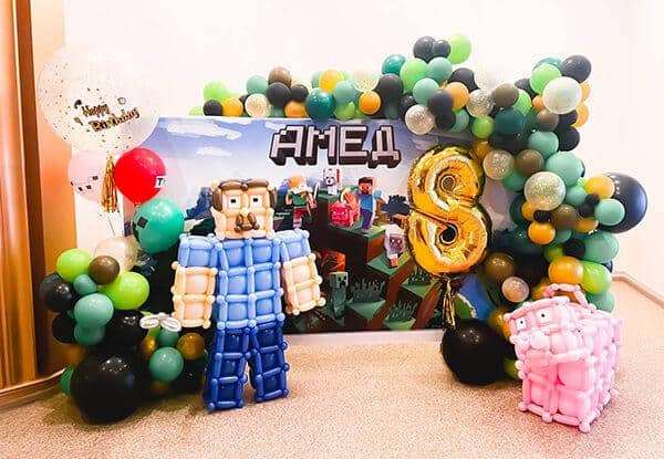 Фотозона, выполненная из разнокалиберной гирлянды в стиле манйнкрафт.